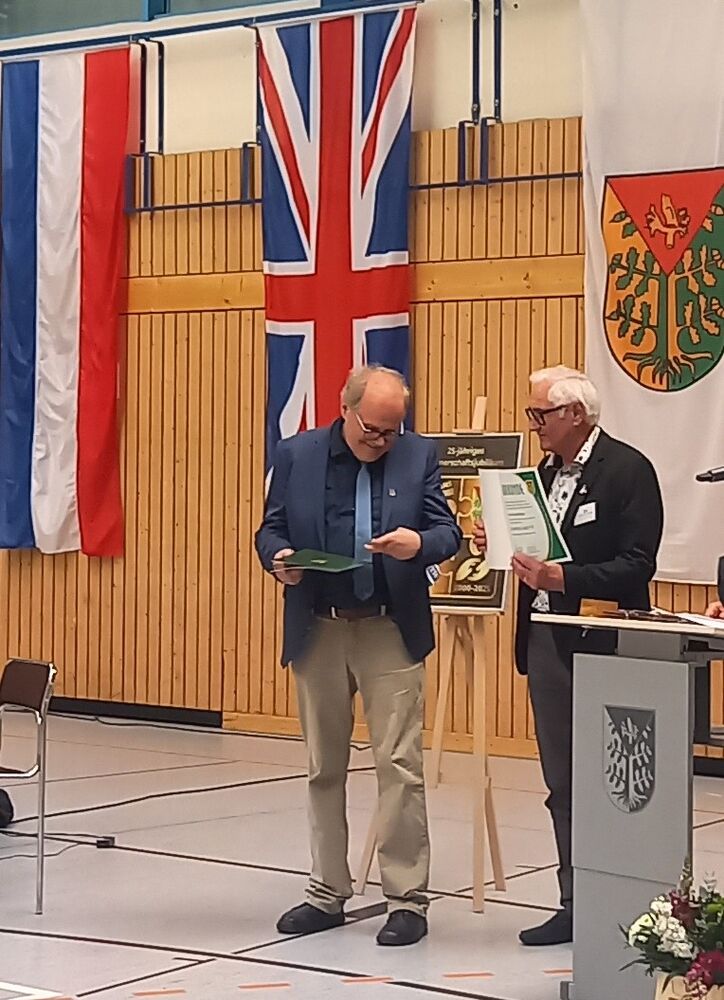 Besonderer Höhepunkt der Feier mit rund 70 Gästen waren die Auszeichnungen mit der Ehrenplakette für Jean-Claude Brige und für Volker Heiermann. Für Volker Heiermann heißt es in der Begründung: "Volker Heiermann hat von Beginn dieser Partnerschaft bis heute mit viel Engagement, viele Jahre als stellvertretender Vorsitzende und besonders Verantwortlicher für die Partnerschaft mit Marquette-lez-Lille, diese Partnerschaft aufgebaut und getragen."