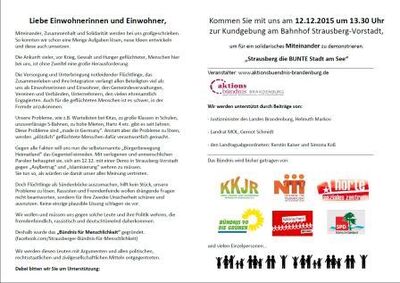 Gegen alle Fakten will uns nun die selbsternannte „Bürgerbewegung Heimatland“ das Gegenteil einreden. Mit verlogenen und unmenschlichen Parolen behauptet sie, sich am 12.12. mit einer Demo in Strausberg-Vorstadt gegen „Asylbetrug“ und „Islamisierung“ wehren zu müssen. Sie tun so, als würden sie damit unser aller Meinung vertreten.